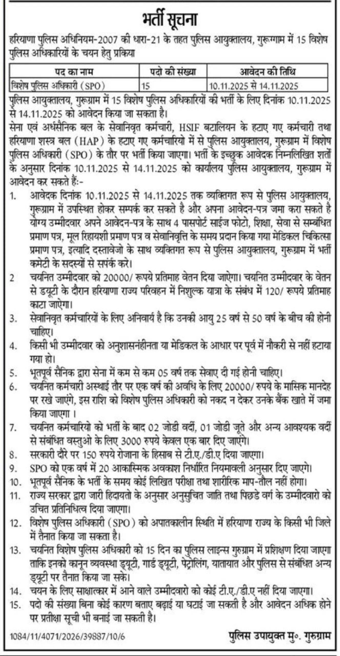 • गुरूग्राम पुलिस SPOs पदों के लिए दिनांक 10/11/2025 से 14/11/2025 तक समय सुबह 9 बजे से शाम 5 बजे पुलिस आयुक्त कार्यालय, गुरूग्राम में आवेदन स्वीकार किए जाएंगे।